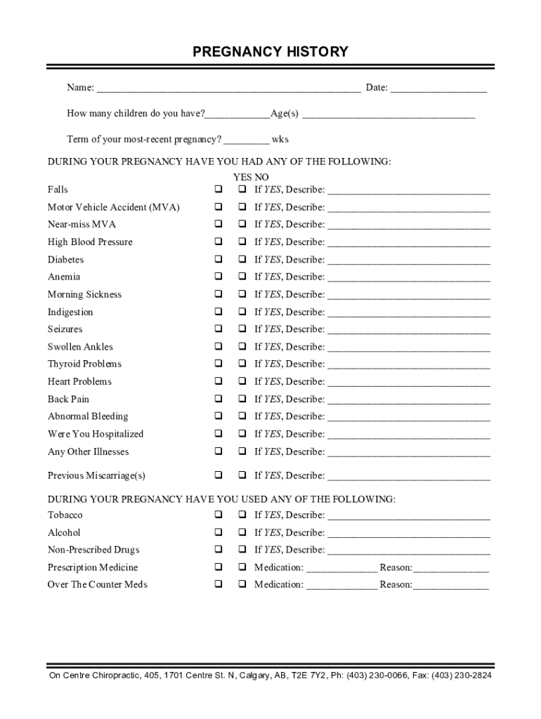 PREGNANCY HISTORY Name: Date: How many children do you have? Age(s) Term of your most recent pregnancy? Was DURING YOUR PREGNANCY HAVE YOU HAD ANY OF THE FOLLOWING: Walleyes NO If YES, Describe: Motor