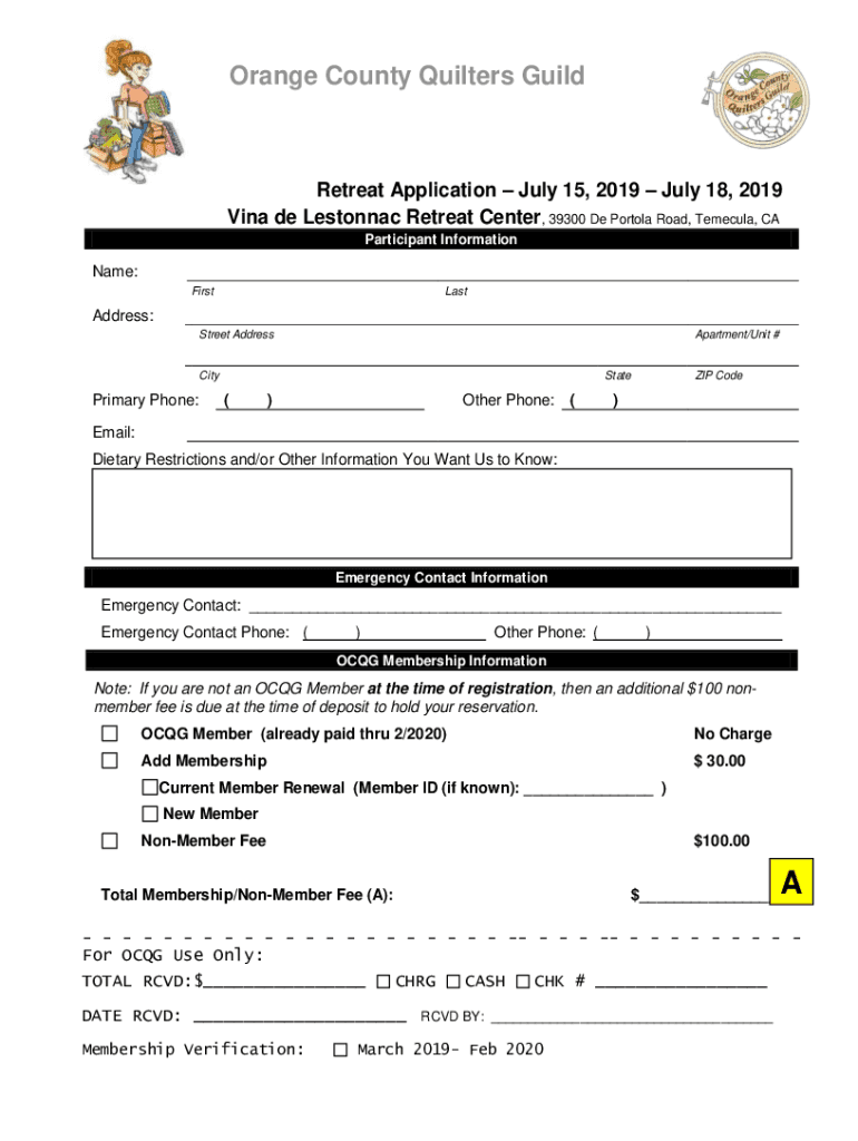 Orange County Quilters Guild Retreat Application July 15, 2019, July 18, 2019, Via de Estonia Retreat Center, 39300 De Tortola Road, Temecula, CA Participant Informational: FirstLastAddress: Street