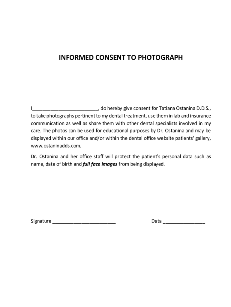 INFORMED CONSENT TO PHOTOGRAPHS, do hereby give consent for Tatiana Stamina D.D.S., to take photographs pertinent to my dental treatment, use them in lab and insurance communication as well as share