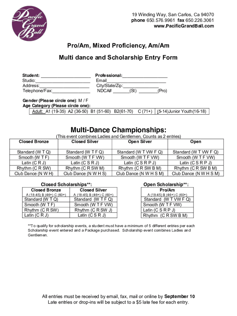 19 Winding Way, San Carlos, Ca 94070 phone 650.576.9961 fax 650.226.3061 www.PacificGrandBall.comPro/Am, Mixed Proficiency, Am/Am Multi dance and Scholarship Entry Form Student: Studio: Address: Telephone/Fax: