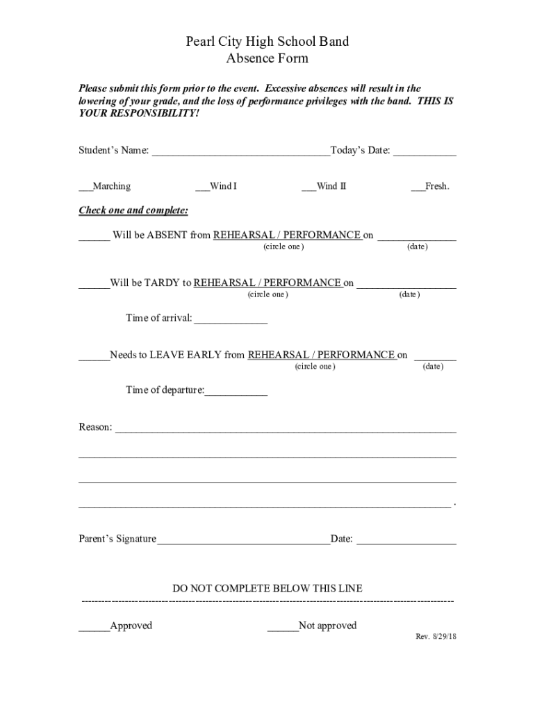 Pearl City High School Band Absence Form Please submit this form prior to the event. Excessive absences will result in the lowering of your grade, and the loss of performance privileges with the band.