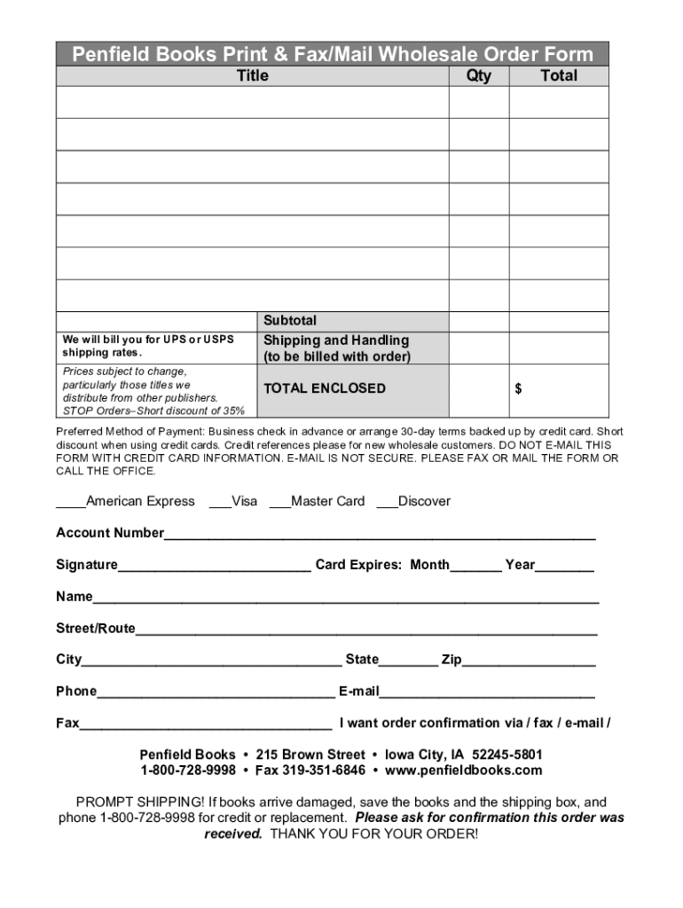 Pen field Books Print & Fax/Mail Wholesale Order Form Title will bill you for UPS or USPS shipping rates. Prices subject to change, particularly those titles we distribute from other publishers. STOP