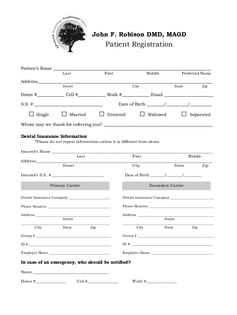 John F. Robinson DMD, MAGDPatient Registration Patients Name LastFirstMiddlePreferred Headdress StreetCityStateZipHome # Cell # Work # Email S.S. # SingleMarriedDate of Birth / / DivorcedWidowedSeparatedWhom