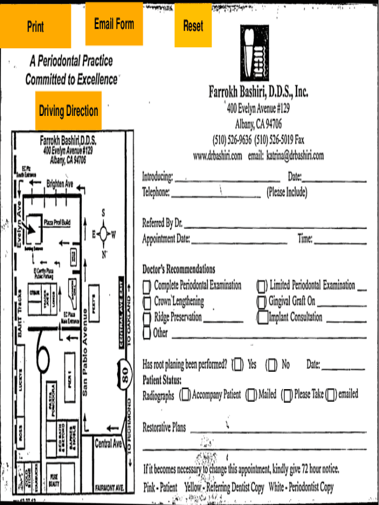 F 'J.?* '* “wrrHrt3St, vfly5×LTV 'V×rt1XB '1S, SF?5* “Email FormPrintReseti4 Periodontal Practice Committed to ExcellenceFarrokh Bashing, D.D.S., Inc. × 400 Evelyn Avenue #129Driving Direction