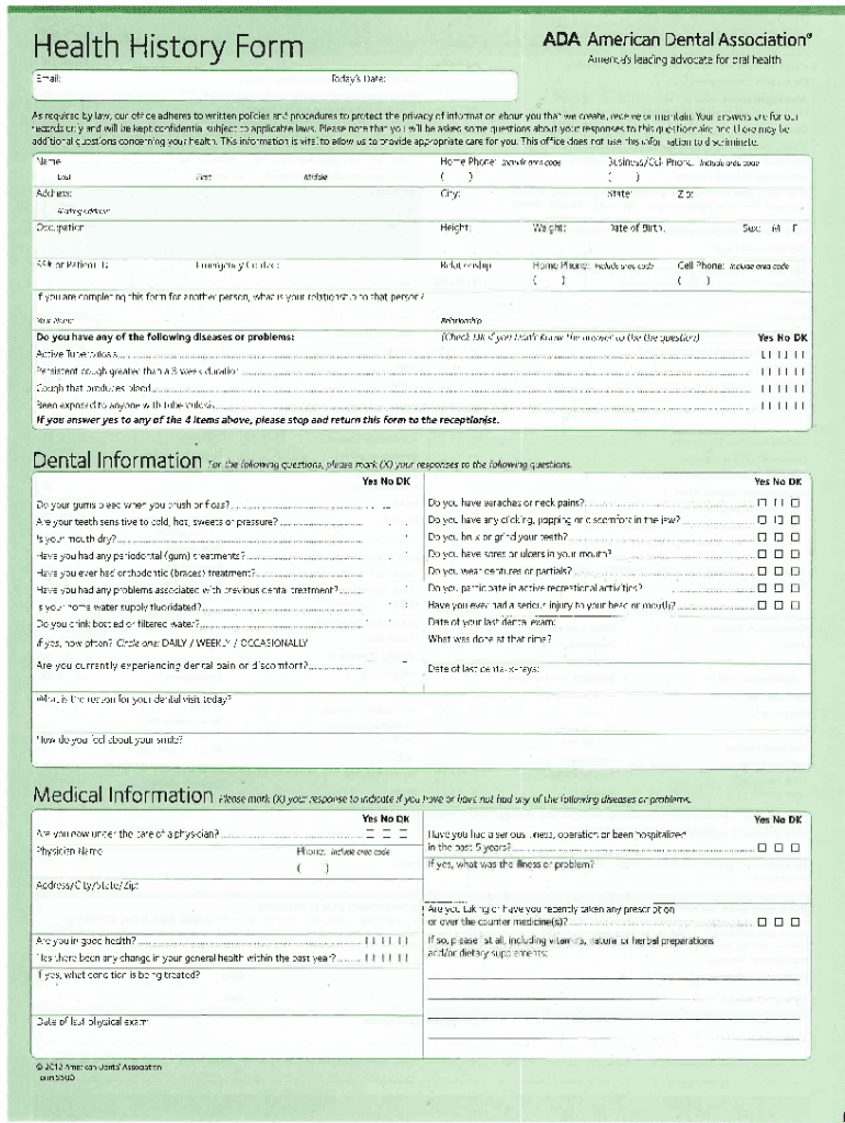 ADA American Dental Association 'Health History Form America's leading advocate for oral health Today's Date:EmaAsrequiredby aw, ourofficeadherestowrittenpo iciesandprocedurestoprotectthe record son