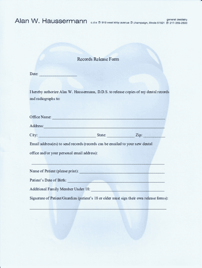 Records Release Form Date: I hereby authorize Alan W. Wassermann, D.D.S. to release copies of my dental records and radiographs to:Office Name: Address: City: State: Zip: Email address(BS) to send