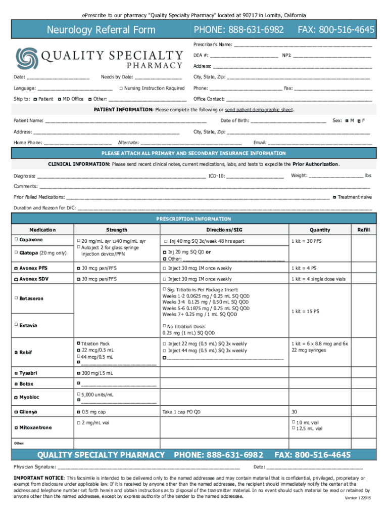 Prescribe to our pharmacy “Quality Specialty Pharmacy located at 90717 in Lolita, CaliforniaNeurology Referral Hormone: 8886316982FAX: 8005164645Prescribers Name: DEA #: NPI: Address: Date: Needs