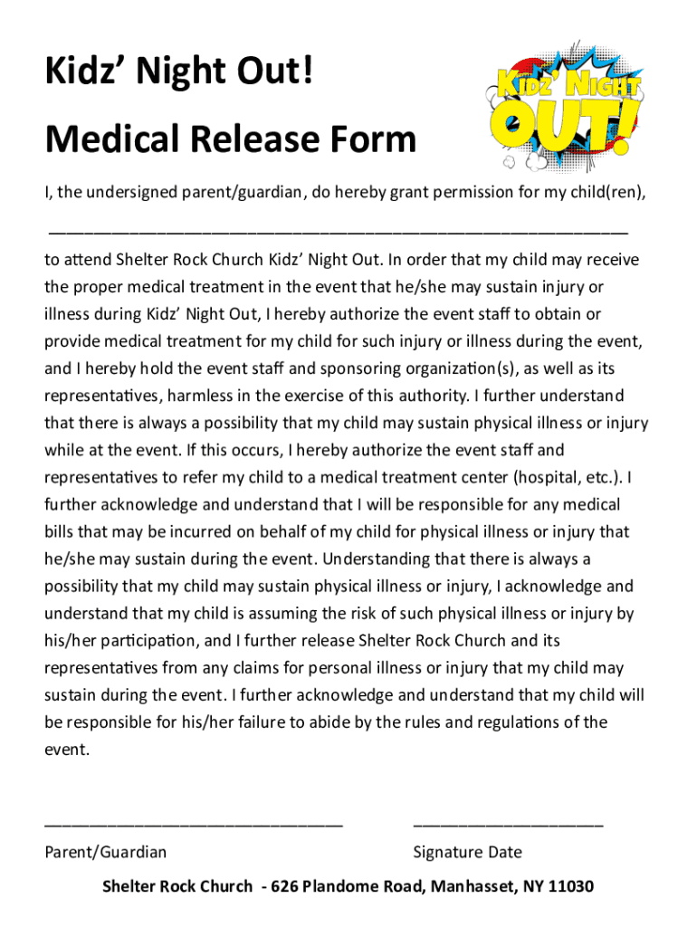 Kids Night Out! Medical Release Form I, the undersigned parent/guardian, do hereby grant permission for my child(men), to attend Shelter Rock Church Kids Night Out. In order that my child may receive