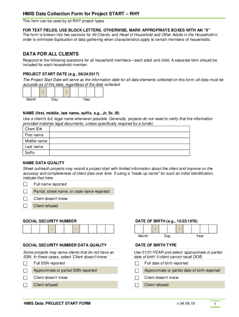 Get the free HMIS Data Collection Form for Project STARTRHY