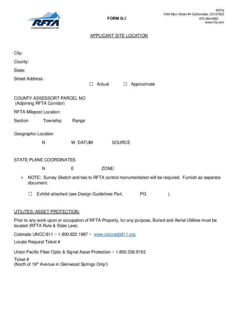 RITA 1340 Main Street #4 Carbondale, CO 81623 970.384.4982 www.rfta.comFORM G2APPLICANT SITE Locationally: County: State: Street Address: Actual ApproximateCOUNTY ASSESSOR PARCEL NO (Adjoining RITA