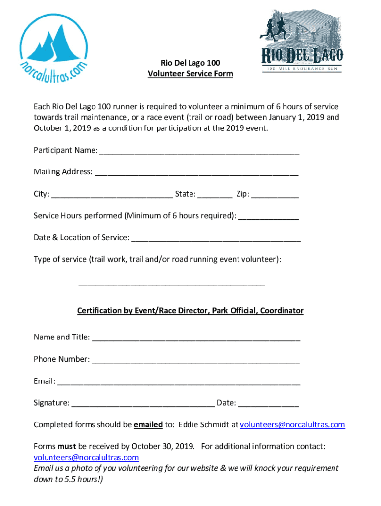 RioDelLago100 VolunteerServiceForm EachRioDelLago100runnerisrequiredtovolunteeraminimumof6hoursofservice towardstrailmaintenance, oraraceevent(railroad)betweenJanuary1,2019and October1,2019asaconditionforparticipationatthe2019event.