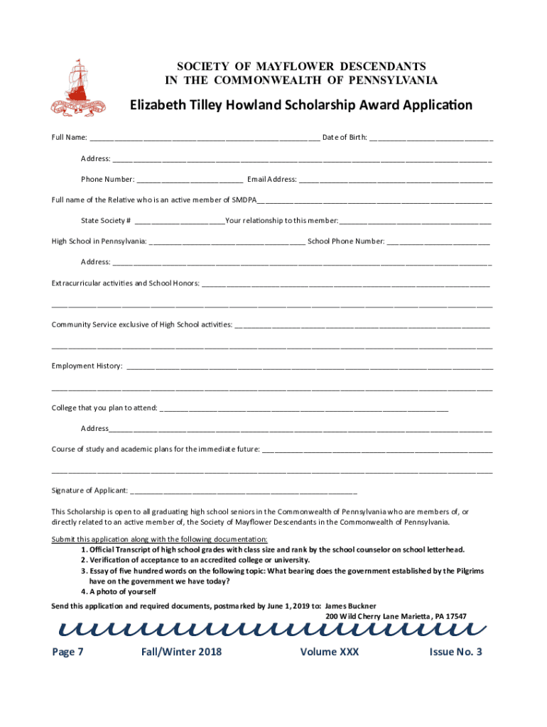 SOCIETY OF MAYFLOWER DESCENDANTS IN THE COMMONWEALTH OF PENNSYLVANIAElizabeth Villa Howland Scholarship Award Application Full Name: Date of Birth: Address: Phone Number: Email Address: Full name