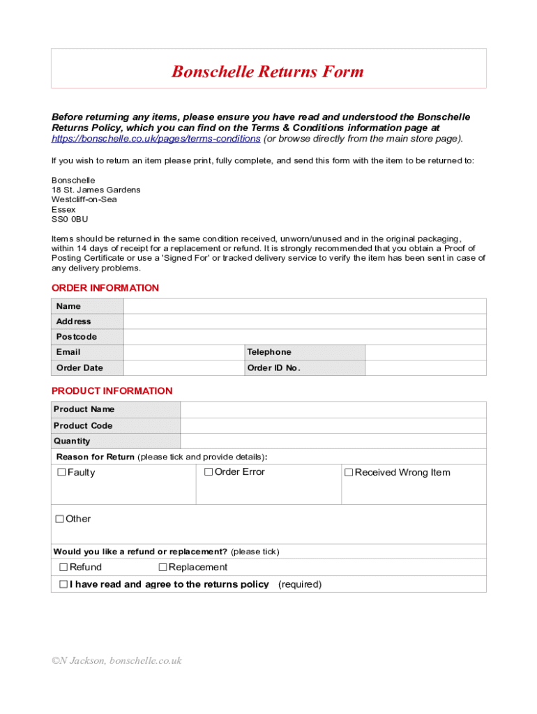 Rochelle Returns Form Before returning any items, please ensure you have read and understood the Rochelle Returns Policy, which you can find on the Terms & Conditions information page at https://bonschelle.co.uk/pages/termsconditions
