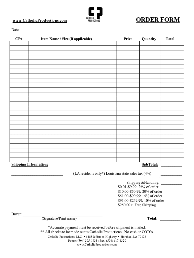 ORDER Form.CatholicProductions.com Date: CP#Item Name / Size (if applicable)Shipping Information: PriceQuantityTotalSubTotal: + (LA residents only*) Louisiana state sales tax (4%) + Shipping handling:
