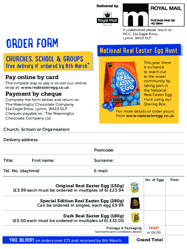 ORDER FORM CHURCHES, SCHOOL & Groups undelivered please return to: MCC, 11a Eagle Brow, Lyme, WA13 0LP. National Real Easter Egg Hunt This year there is a chance to reach out to the wider community