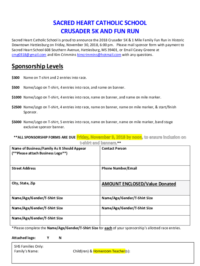 SACREDHEARTCATHOLICSCHOOL CRUSADER5KANDFUNRUN SacredHeartCatholicSchoolisproudtoannouncethe2018Crusader5K&1MileFamilyFunRuninHistoric DowntownHattiesburgonFriday,November30,2018,6:00pm. Pleasemailsponsorformwithpaymentto
