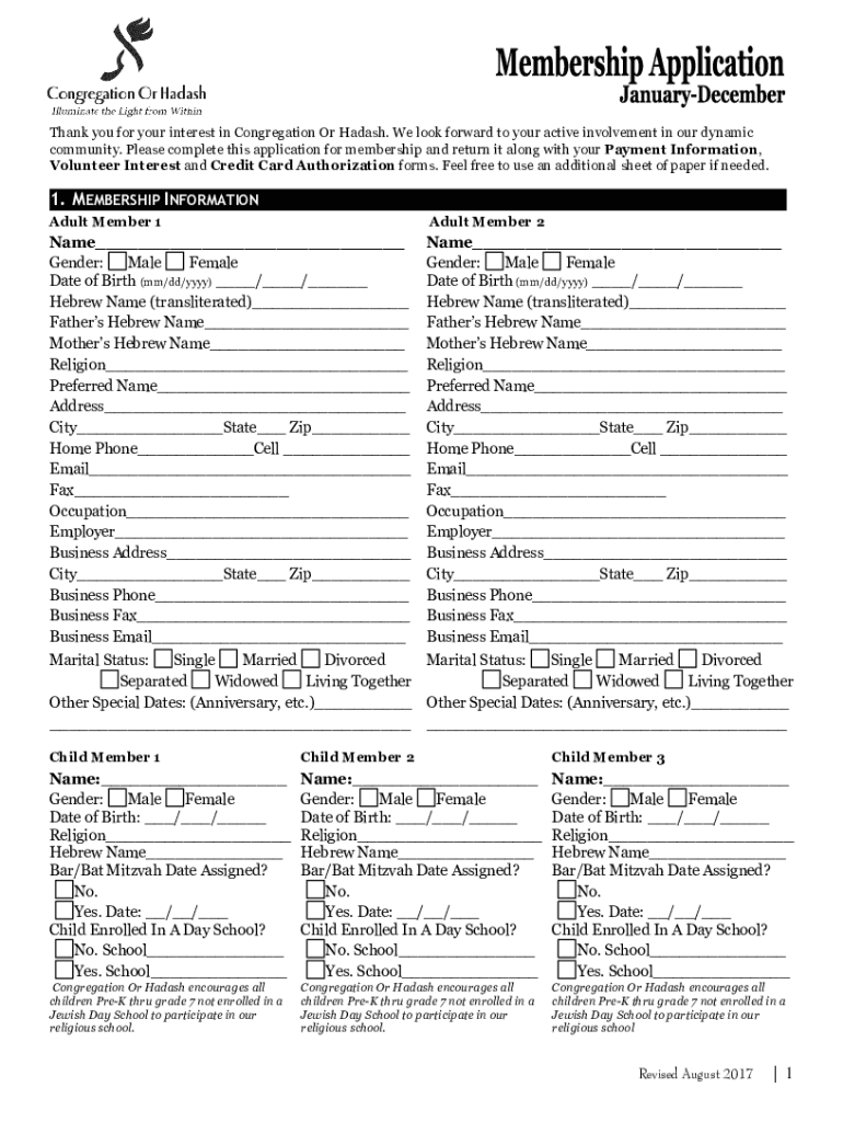 Thank you for your interest in Congregation Or Ha dash. We look forward to your active involvement in our dynamic community. Please complete this application for membership and return it along with