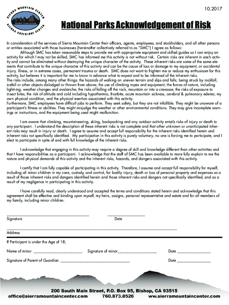 Get the free NPS Acknowledgement of Risk Form - Sierra Mountain Center