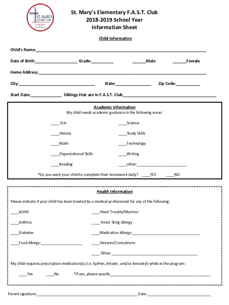 St. Mary's Elementary F.A.S.T. Club 20182019 School Year Information Sheet Child Information Child's Name: Date of Birth: Grade: Male FemaleHome Address: City: State: Zip Code: Start Date: Siblings