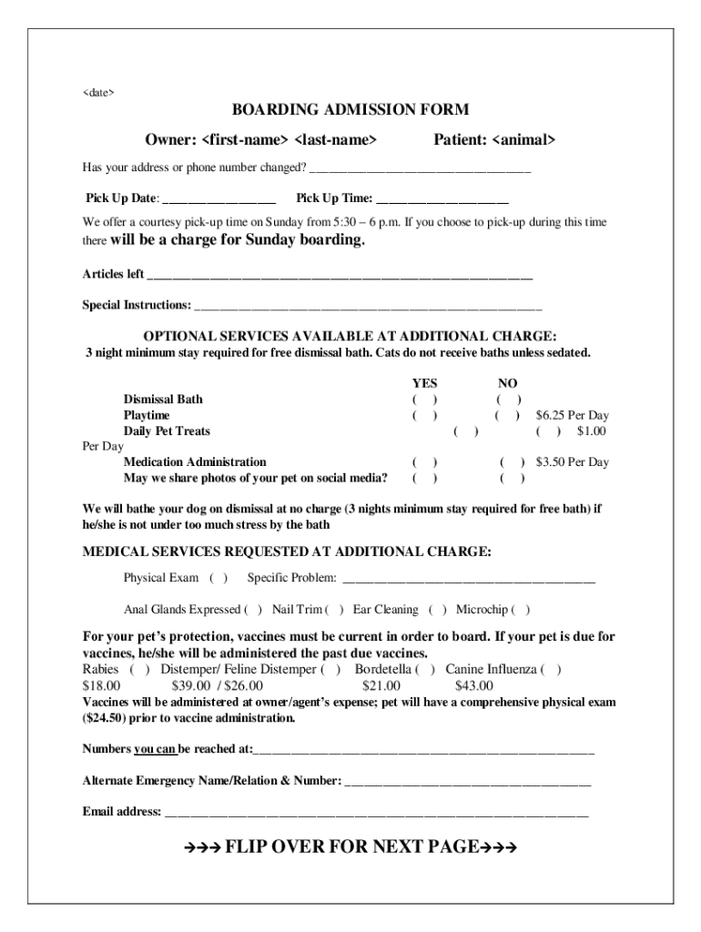 Skateboarding ADMISSION FORM Owner: first name lastnamePatient: animals your address or phone number changed? Pick Up Date: Pick Up Time: We offer a courtesy pickup time on Sunday from 5:30 6 p.m.