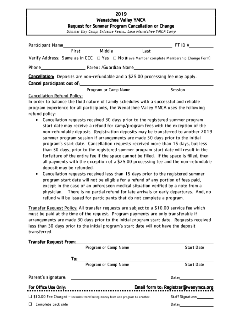 2019 Wenatchee Valley YMCA Request for Summer Program Cancellation or Change Summer Day Camp, Extreme Teens, Lake Wenatchee YMCA CampParticipant Name ID #First Middle Last Verify Address: Same as