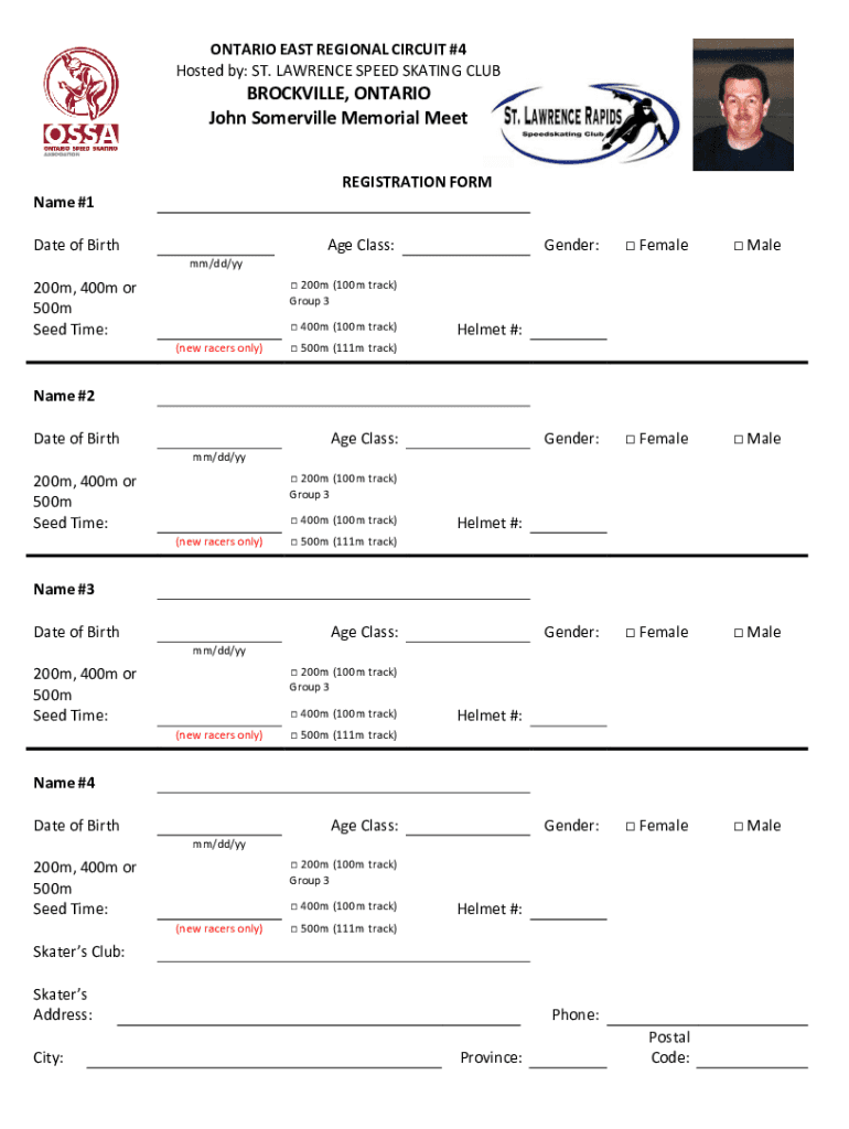 ONTARIO EAST REGIONAL CIRCUIT #4 Hosted by: ST. LAWRENCE SPEED SKATING CLUBBROCKVILLE, ONTARIO John Somerville Memorial Meet REGISTRATION FORM Name #1 Date of Carthage Class:Gender: Female Alexander: