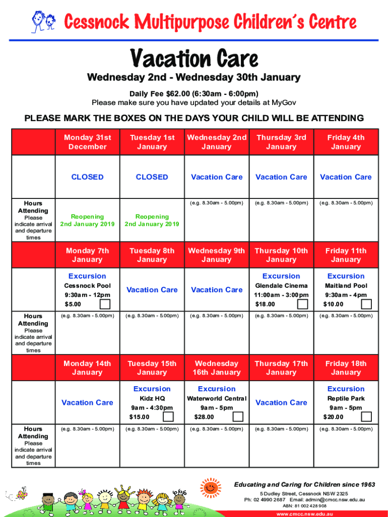 Daily Fee $62.00 (6:30am 6:00pm) Please make sure you have updated your details at MyGovPLEASE MARK THE BOXES ON THE DAYS YOUR CHILD WILL BE ATTENDINGHours AttendingPlease indicate arrival and departure
