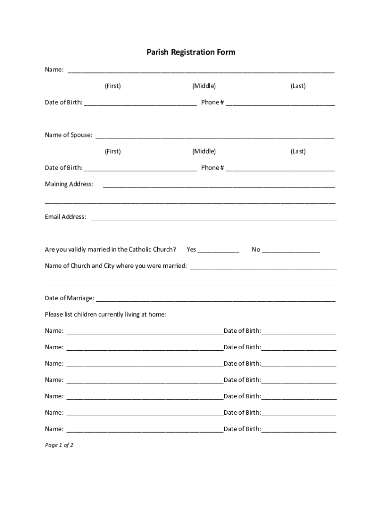 Parish Registration Form Name: (First)(Middle)(Last)Date of Birth: Phone # Name of Spouse: (First)(Middle)(Last)Date of Birth: Phone # Mining Address: Email Address: Are you validly married in the