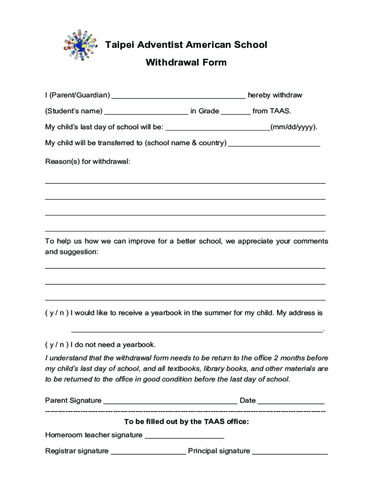Taipei Adventist American School Withdrawal Form I (Parent/Guardian) hereby withdraw (Students name) in Grade from TAGS. My children last day of school will be: (mm/dd/YYY). My child will be transferred