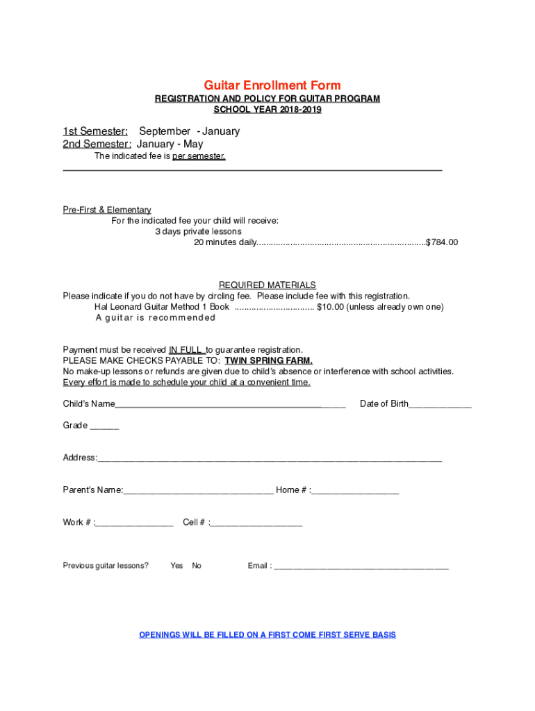 Guitar Enrollment Form REGISTRATION AND POLICY FOR GUITAR PROGRAM SCHOOL YEAR 201820191st Semester: September January 2nd Semester: January May ! The indicated fee is per semester. ! Prefers & Elementary