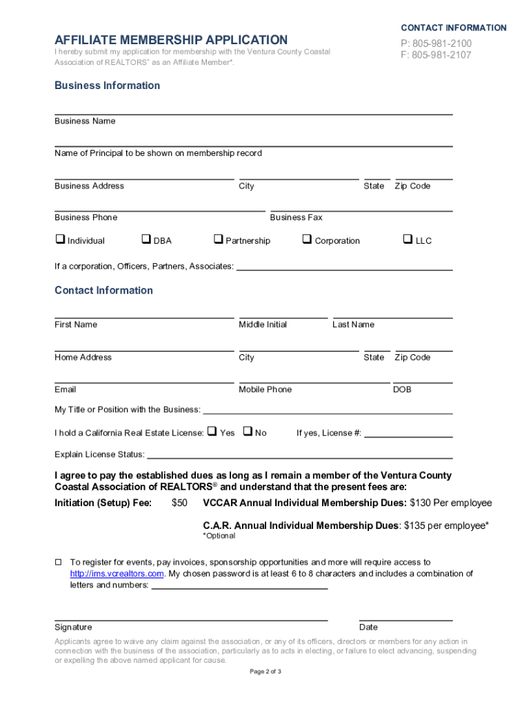 Ventura County Coastal Association of REALTORSCONTACT INFORMATIONAFFILIATE MEMBERSHIP APPLICATION: 8059812100