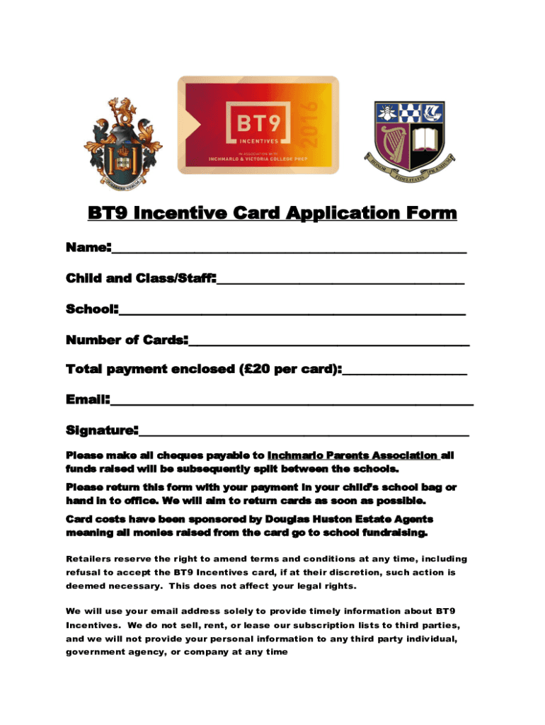 BT9 Incentive Card Application Form Name: Child and Class/Staff: School: Number of Cards: Total payment enclosed (20 per card): Email: Signature: Please make all checks payable to Inchmarlo Parents