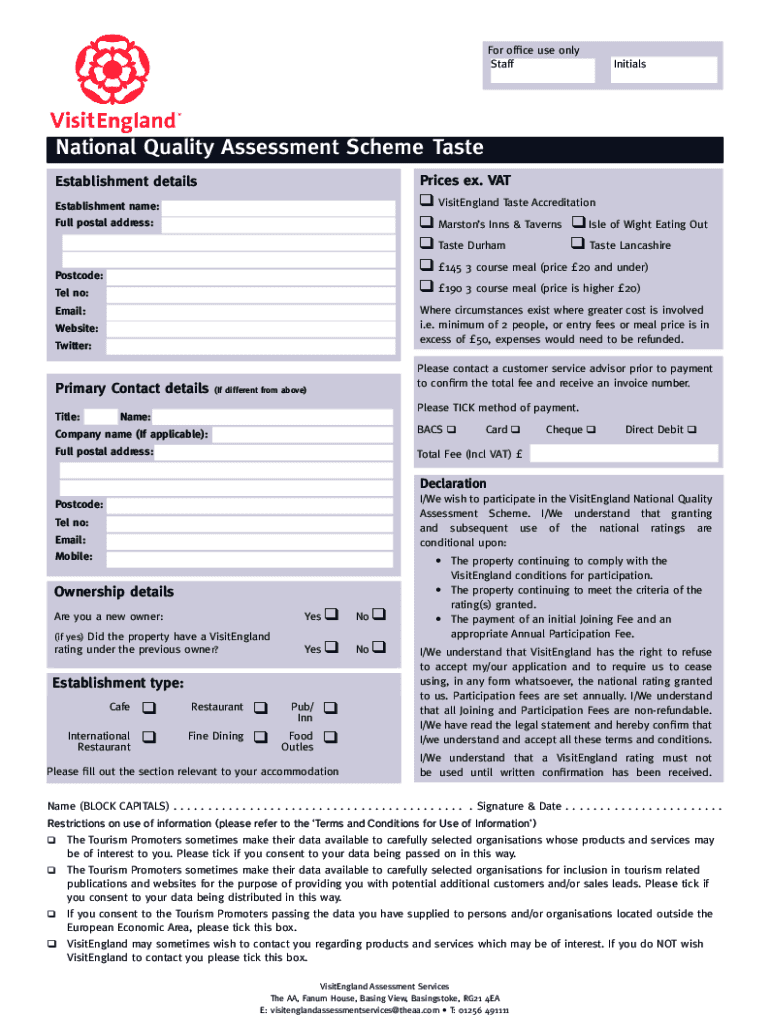 For office use only StaffInitialsNational Quality Assessment Scheme Taste Prices ex. VAT Establishment details Visit England Taste Accreditation q Mars tons Inns & Taverns q Isle of Wight Eating Out