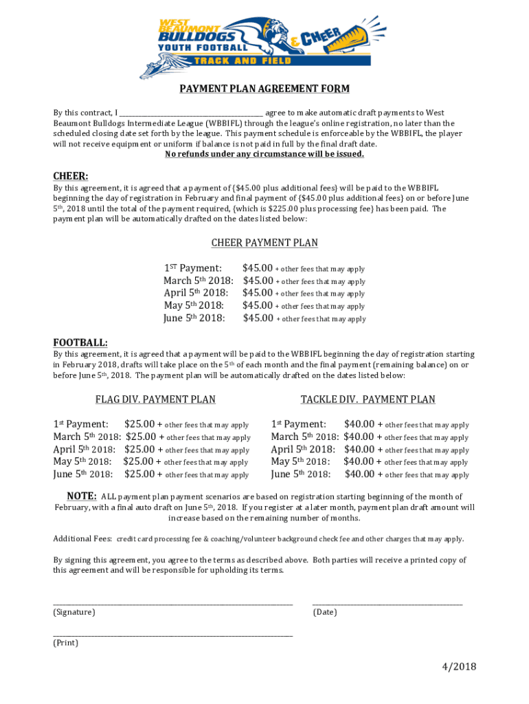 PAYMENT PLAN AGREEMENT Form this contract, I agree to make automatic draft payments to West Beaumont Bulldogs Intermediate League (WILL) through the leagues online registration, no later than the