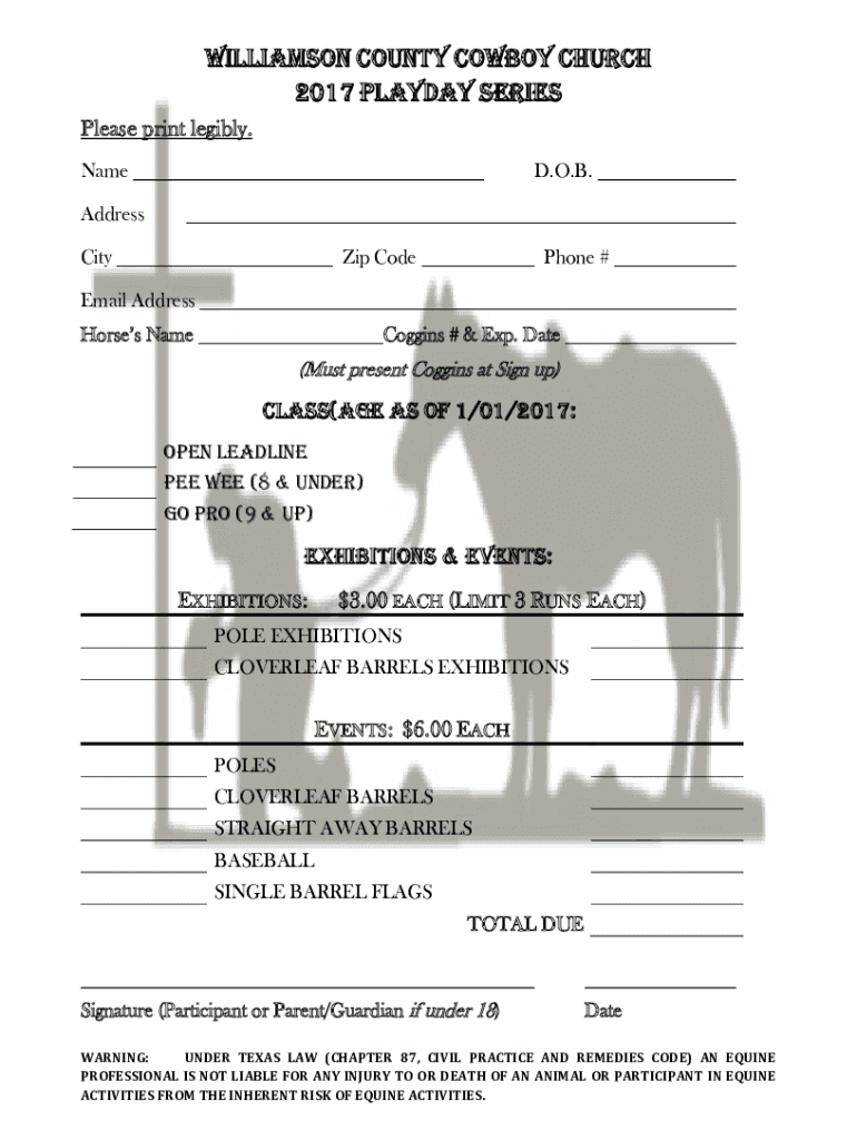 Williamson County Cowboy Church 2017 Payday series Please print legibly. Named. O.B. Address City Telephone #Email Address Horses NameCoggins # & Exp. Date(Must present Noggins at Sign up)CLASS(age