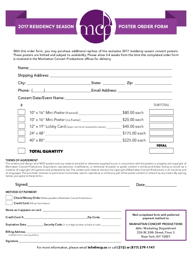 2017 RESIDENCY SEASONPOSTER ORDER Forthwith this order form, you may purchase additional replicas of the exclusive 2017 residency season concert posters. These posters are limited and subject to availability.