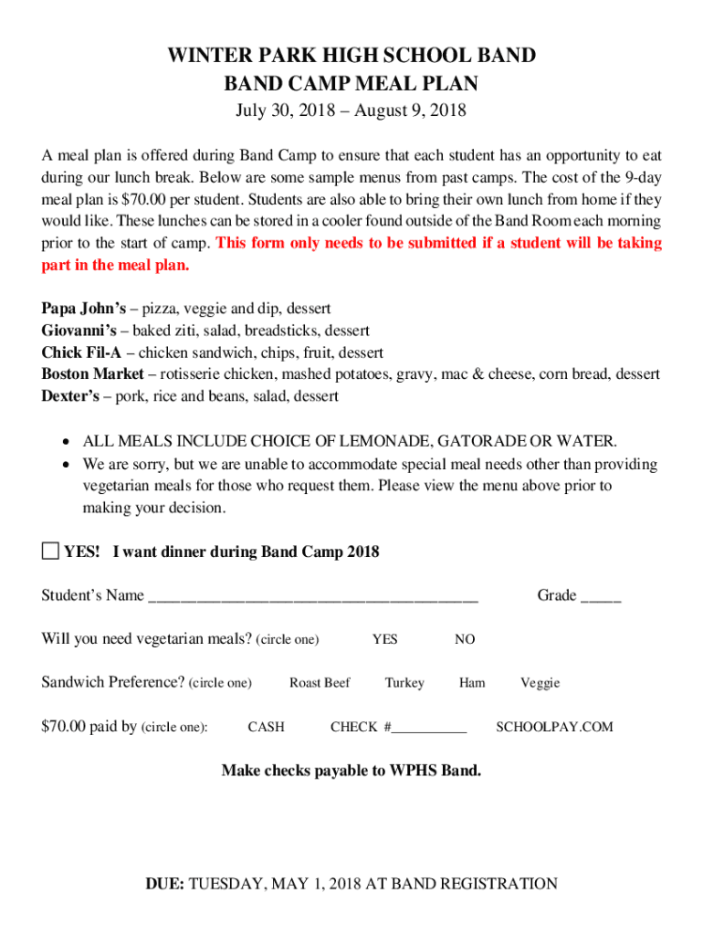 WINTER PARK HIGH SCHOOL BAND CAMP MEAL PLAN July 30, 2018, August 9, 2018, A meal plan is offered during Band Camp to ensure that each student has an opportunity to eat during our lunch break. Below