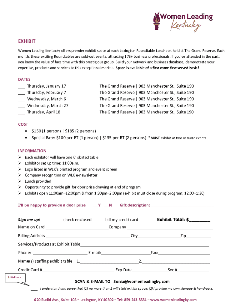 EXHIBIT Women Leading Kentucky offers premier exhibit space at each Lexington Roundtable Luncheon held at The Grand Reserve. Each month, these exciting Roundtables are holdout events, attracting 175+