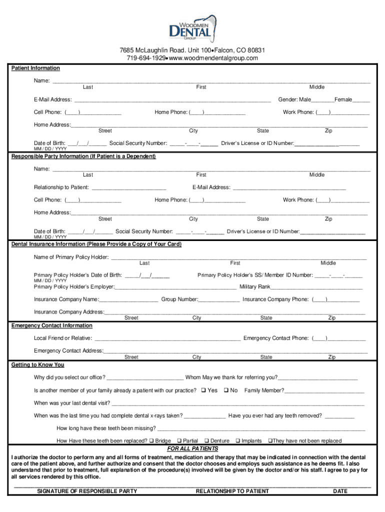 7685 McLaughlin Road. Unit 100Falcon, CO 80831 7196941929www.woodmendentalgroup.com Patient Information Name: LastFirstMiddleEMail Address: Cell Phone: () Home Phone: () Gender: Male Female Work Phone: