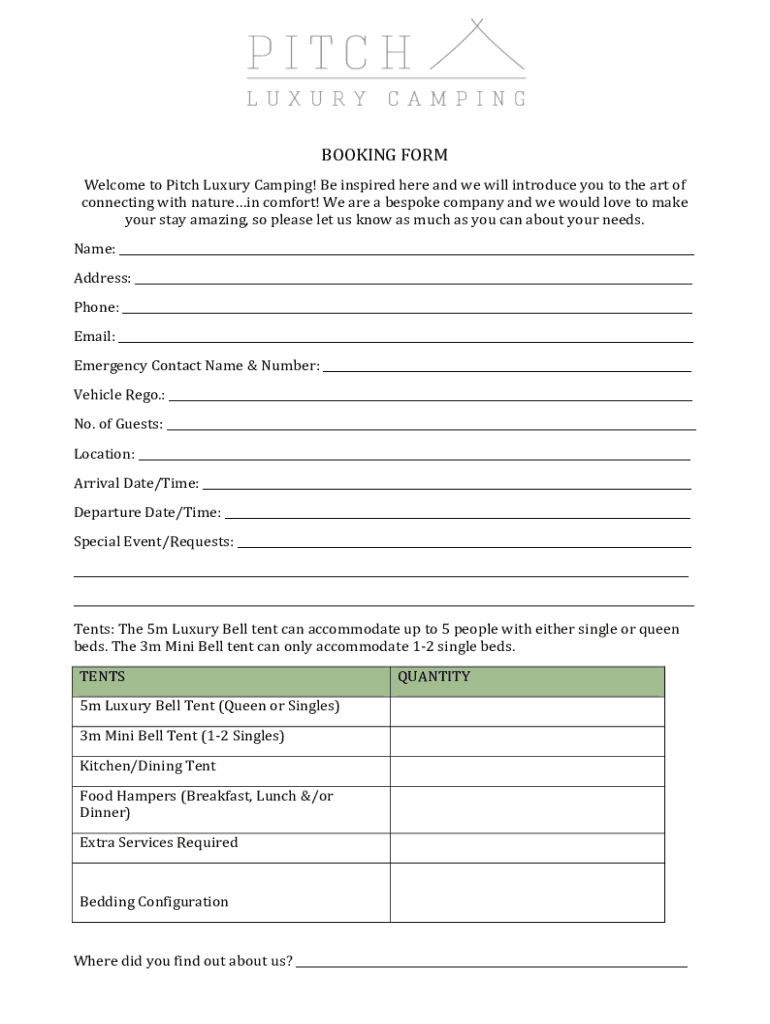 BOOKING FORMWelcome to Pitch Luxury Camping! Be inspired here, and we will introduce you to the art of connecting with natural comfort! We are a bespoke company, and we would love to make your stay