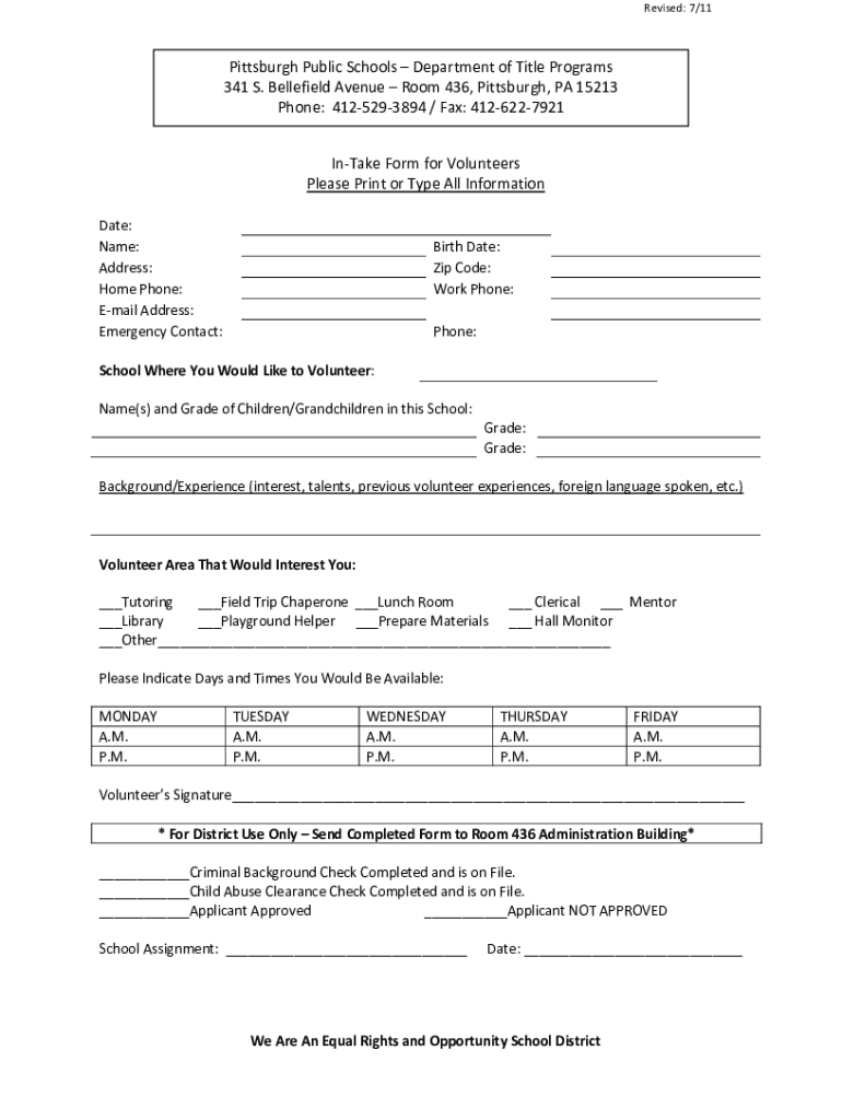 Revised:7/11PittsburghPublicSchoolsDepartmentofTitlePrograms 341S. BellefieldAvenueRoom436,Pittsburgh,PA15213 Phone:4125293894/Fax:4126227921 InTakeFormforVolunteers PleasePrintorTypeAllInformation