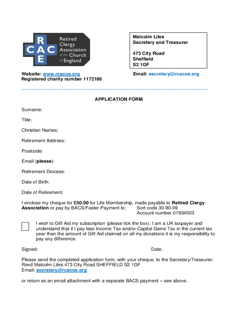 Registered charity number 1172186Email: secretary@rcacoe.orgAPPLICATION FORM