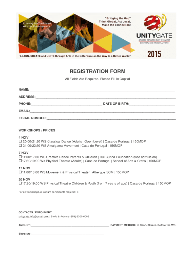 REGISTRATION Forms All Fields Are Required. Please Fill In Capitalism: ADDRESS: PHONE: DATE OF BIRTH: EMAIL: FISCAL NUMBER: WORKSHOPS / PRICES 4 NOV 20:00/21:30 WS Classical Dance (Adults Open Level)