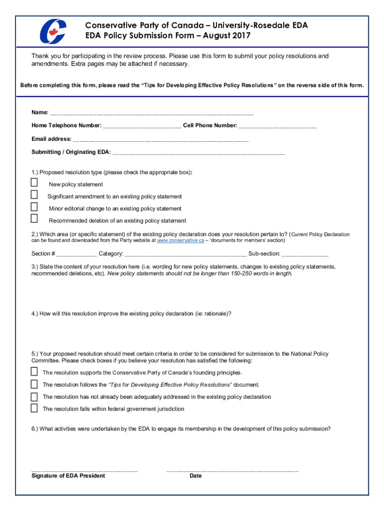 Conservative Party of Canada UniversityRosedale EDA Policy Submission Form August 2017 Thank you for participating in the review process. Please use this form to submit your policy resolutions and