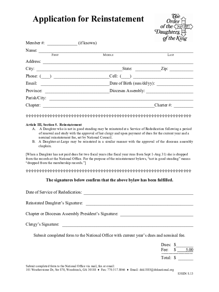 Application for Reinstatement Member #: (if known) Name: FIRSTMIDDLELASTAddress: City: State: Zip: Phone: () Cell: () Email: Date of Birth (mm/dd/by): Province: Diocesan Assembly: Parish/City: Chapter: