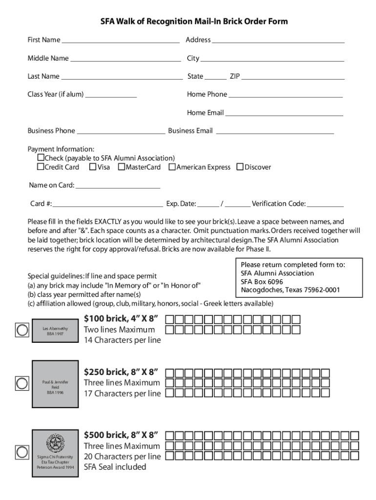 SFA Walk of Recognition Mailing Brick Order Form First Name Address Middle Name City Last Name State ZIP Class Year (if alum) Home Phone Home Email Business Phone Business Email Payment Information: