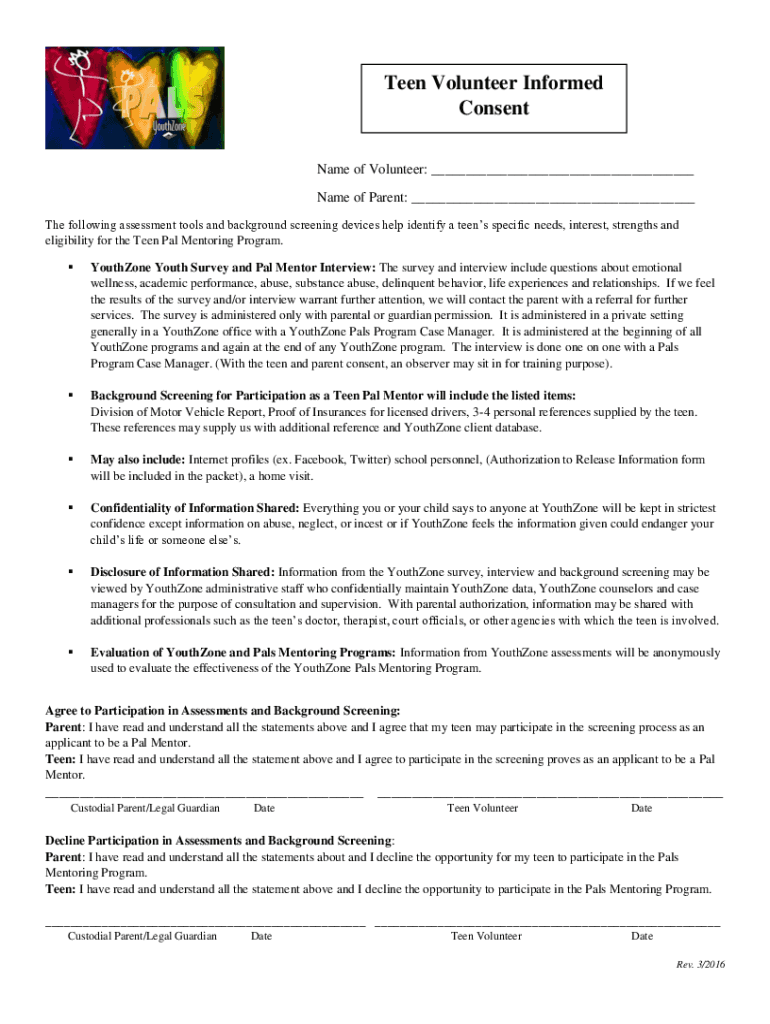 Teen Volunteer Informed Consent Name of Volunteer: Name of Parent: The following assessment tools and background screening devices help identify a teen specific needs, interest, strengths and eligibility