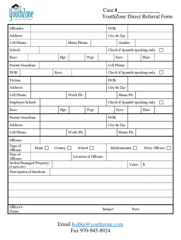 Case # Outdone Direct Referral Form Offender:DOB:Address:City & Zip:Cell Phone:Home Phone:Gender:School: Race:Check if Spanish speaking only Hgt:Wet:Eyes:Parent/Guardian: DOB:Cell Phone: Race:Check