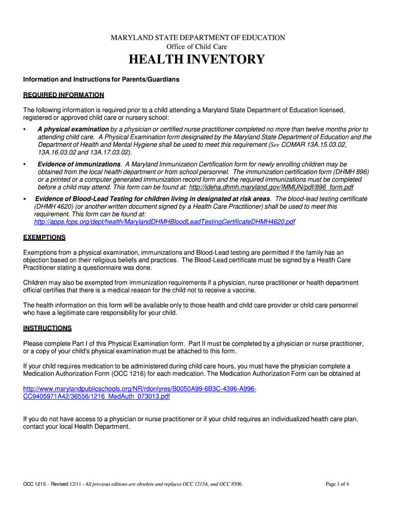 To assist users in accurately completing the Maryland Child Care Health Inventory Form, a sample or example of a filled-out form can be very beneficial. This visual guide highlights essential sections and indicates how to properly enter data regarding physical exams, immunizations, and any reported conditions.