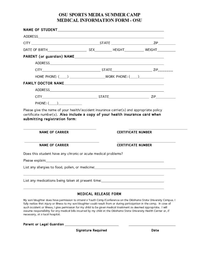 OSU SPORTS MEDIA SUMMER CAMP MEDICAL INFORMATION FORM OSU NAME OF STUDENT ADDRESS CITYSTATEDATE OF BIRTHSEXZIP HEIGHTWEIGHTPARENT (or guardian) NAME ADDRESS CITYSTATEHOME PHONE: ()ZIP WORK PHONE: